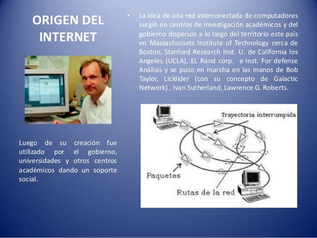 Es decir que el origen de Internet proviene de las investigaciones universitarias y del Ministerio de Defensa de Estados Unidos.Durante las décadas de 1960, 1970 y principios de 1980, el uso de Internet estuvo limitado al intercambio entre comunidades científicas y universitarias.
